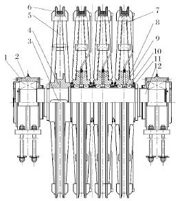 目前在用的多繩摩擦式提升機天輪裝置結(jié)構(gòu)有兩種,普通天輪裝置和新型天輪裝置。