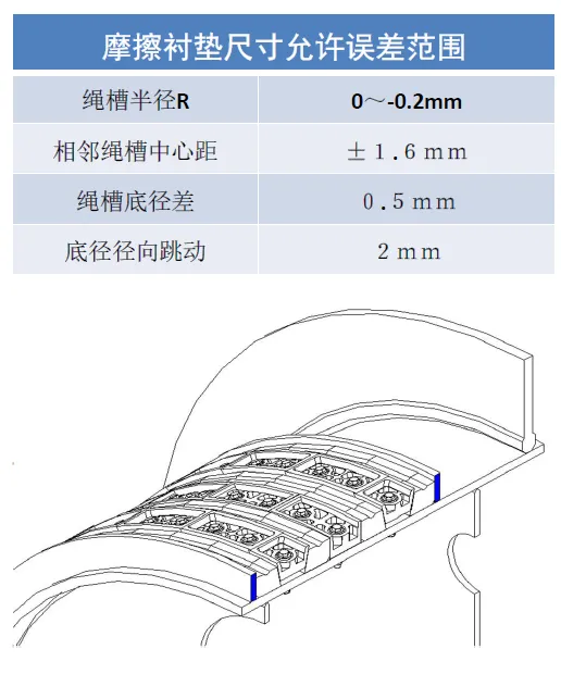 當(dāng)磨損達(dá)到一個(gè)鋼絲繩直徑的深度,或沿側(cè)面磨損達(dá)鋼絲繩直徑一半時(shí),或襯墊磨損后剩余厚度為鋼絲繩直徑的一半時(shí),三種情況中有一種就應(yīng)更換襯墊。